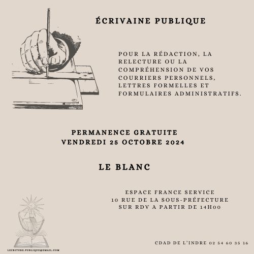 Permanence d’écrivain public à l’Espace France Services du Blanc le 3ème vendredi (mois pairs) de chaque mois.